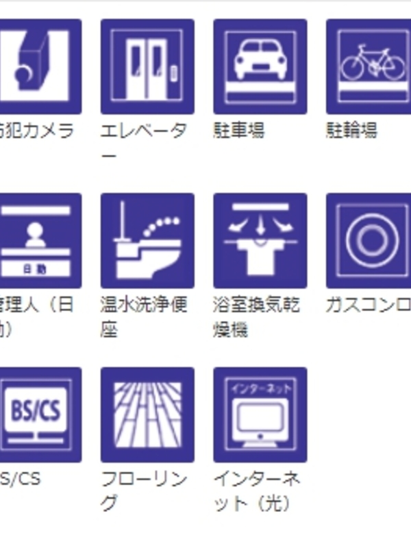 | 建物設備 | オートロック , TVモニター付インターフォン , 防犯カメラ , ディンプルキー , ダブルロック , 宅配ボックス , 24時間セキュリティシステム , エアコン , エレベーター , BS , CS , CATV , 光ファイバー , 駐車場 , バイク置場 , 駐輪場 , 敷地内ゴミ置場 , 24時間ゴミ出し可 , 内廊下 | ||