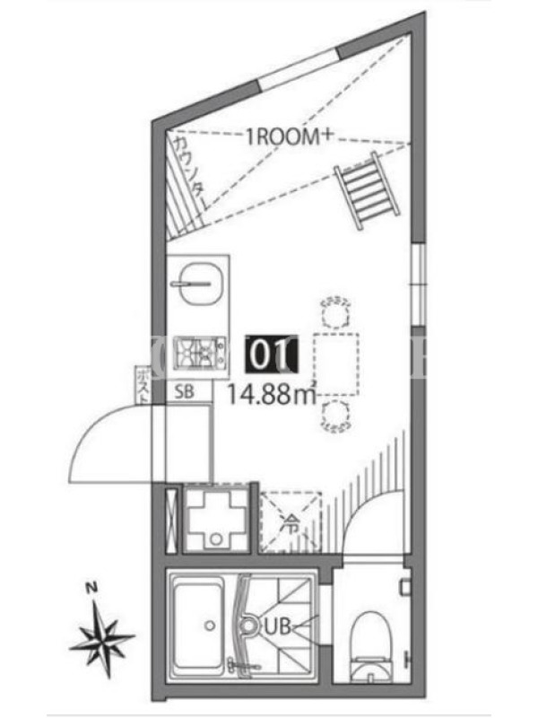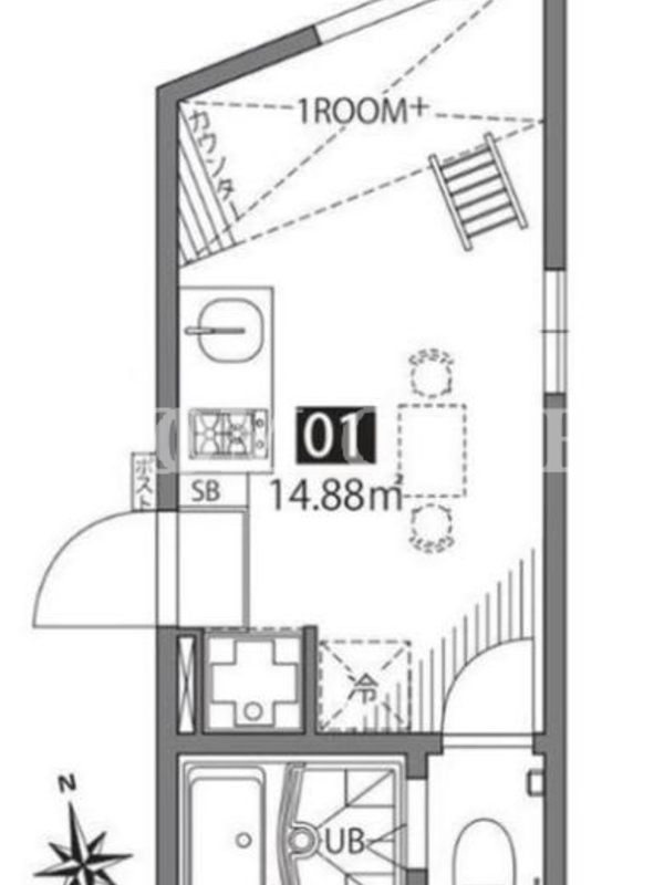 敷金0.0ヶ月、 東向き、 広さ14.88平米のお部屋です。