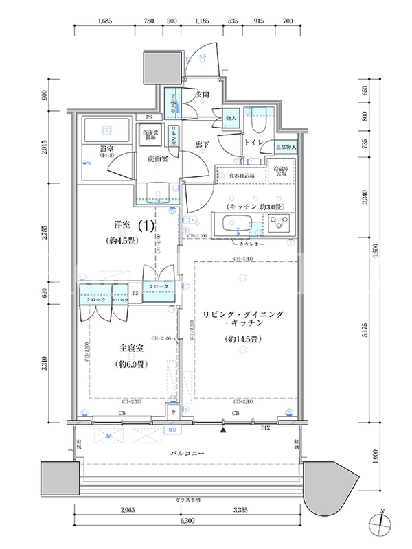 敷金1.0ヶ月、 南向き、 広さ56.52平米のお部屋です。