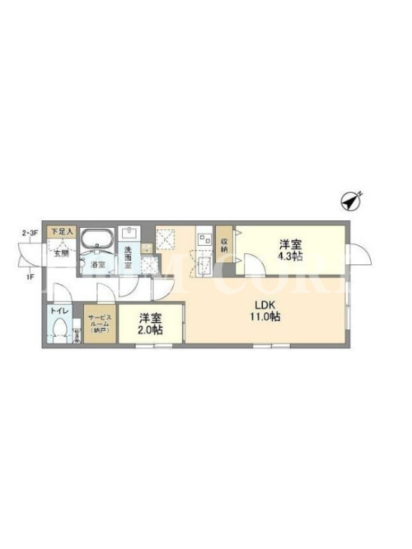 敷金1.0ヶ月、 北東向き、 広さ43.47平米のお部屋です。