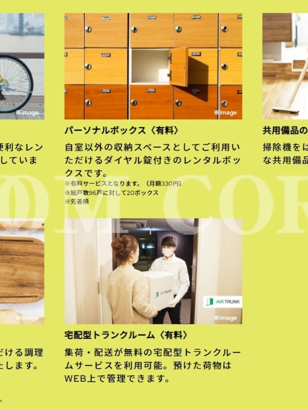 建物設備 楽器相談 , オートロック , TVモニター付インターフォン , 防犯カメラ , ディンプルキー , 宅配ボックス , 24時間セキュリティシステム , エアコン , エレベーター , BS , CS , CATV , 光ファイバー , 駐車場 , バイク置場 , 駐輪場 , 敷地内ゴミ置場