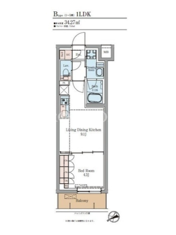 敷金0.0ヶ月、 西向き、 広さ34.27平米のお部屋です。